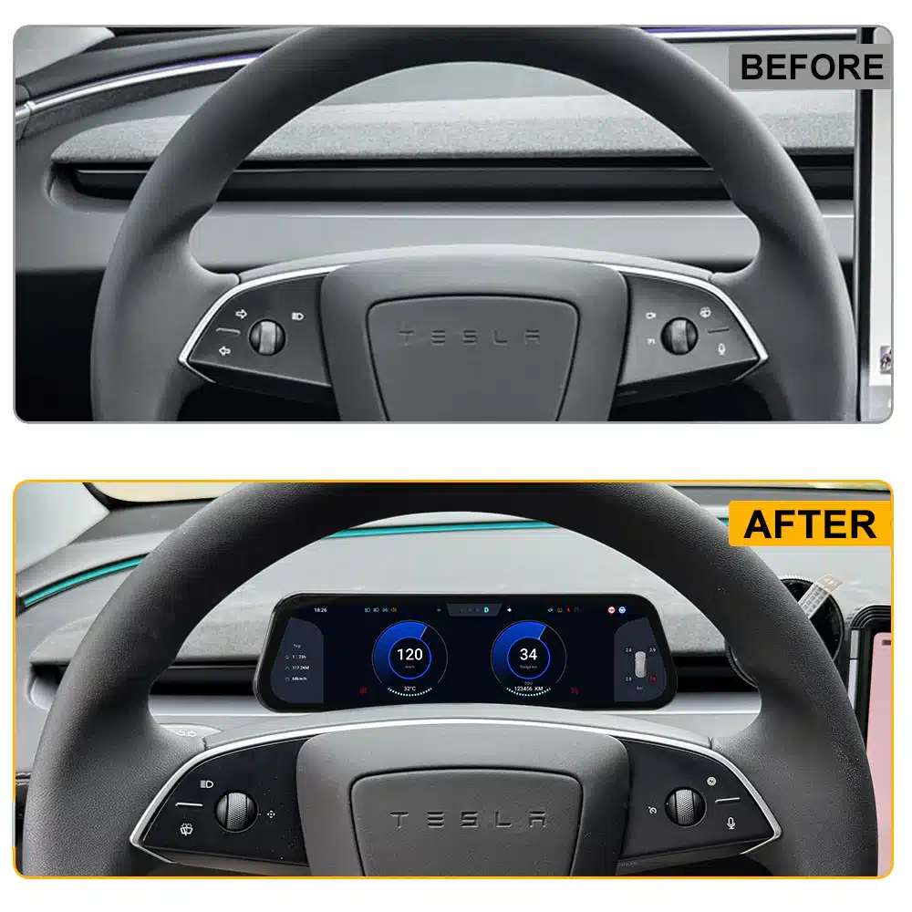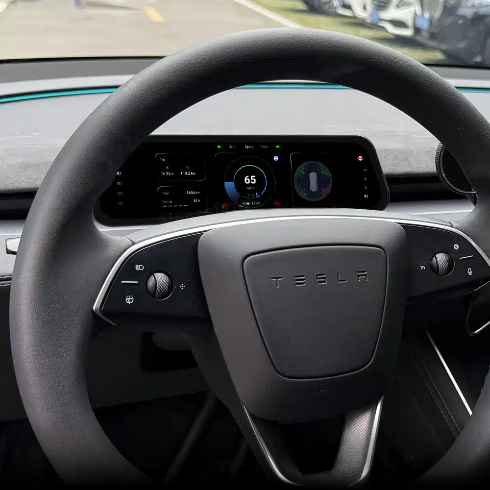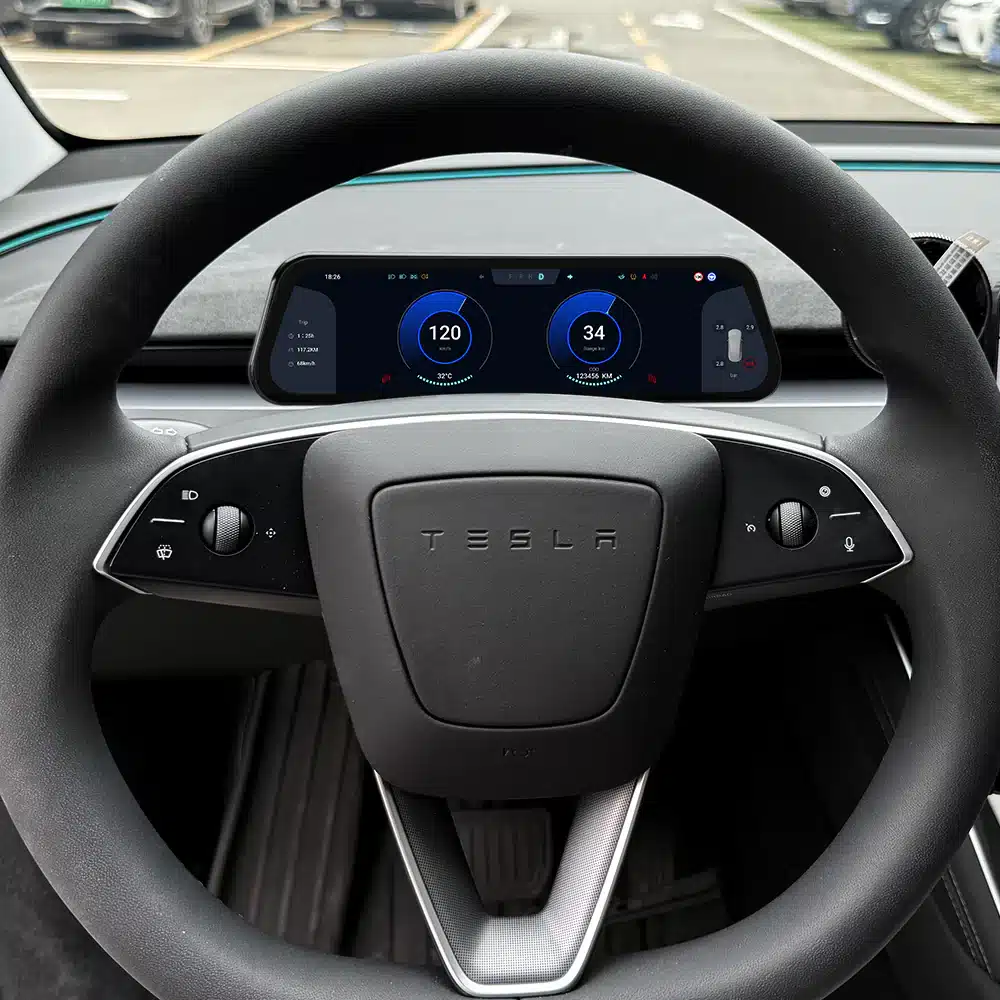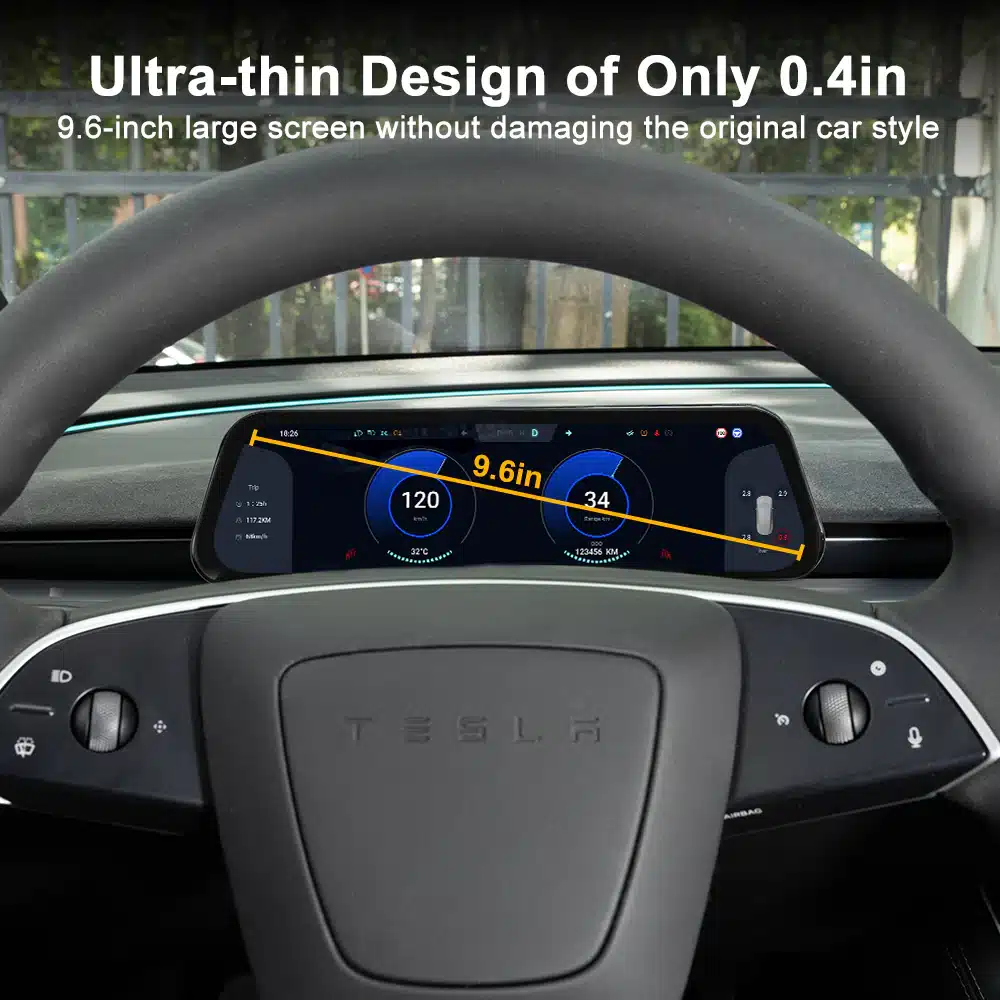 Upgrade je cockpit met het 2026 Heads Up Display voor Tesla Model 3 Highland (2023.10+) en Model Y Juniper (2025.03+). Dit ultra-slimme 9.6” touchscreen geeft je een strak, fabriekswaardig extra scherm direct voor het stuur, met een moderne interface en snelle prestaties. Geschikt voor Standard, Long Range (Premium) en Performance.