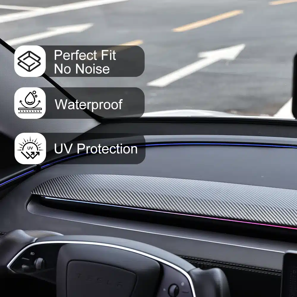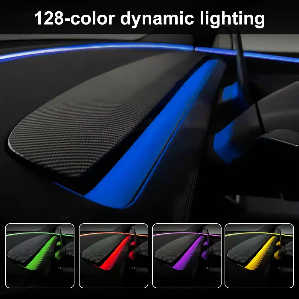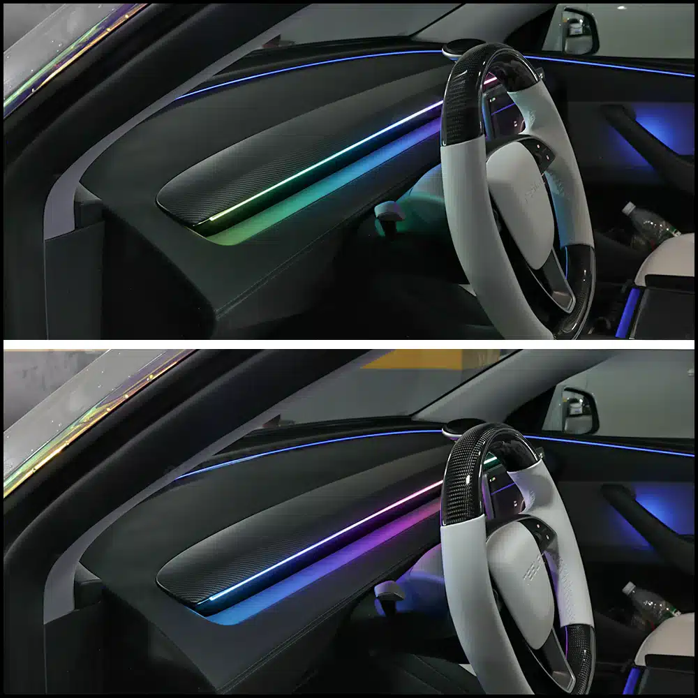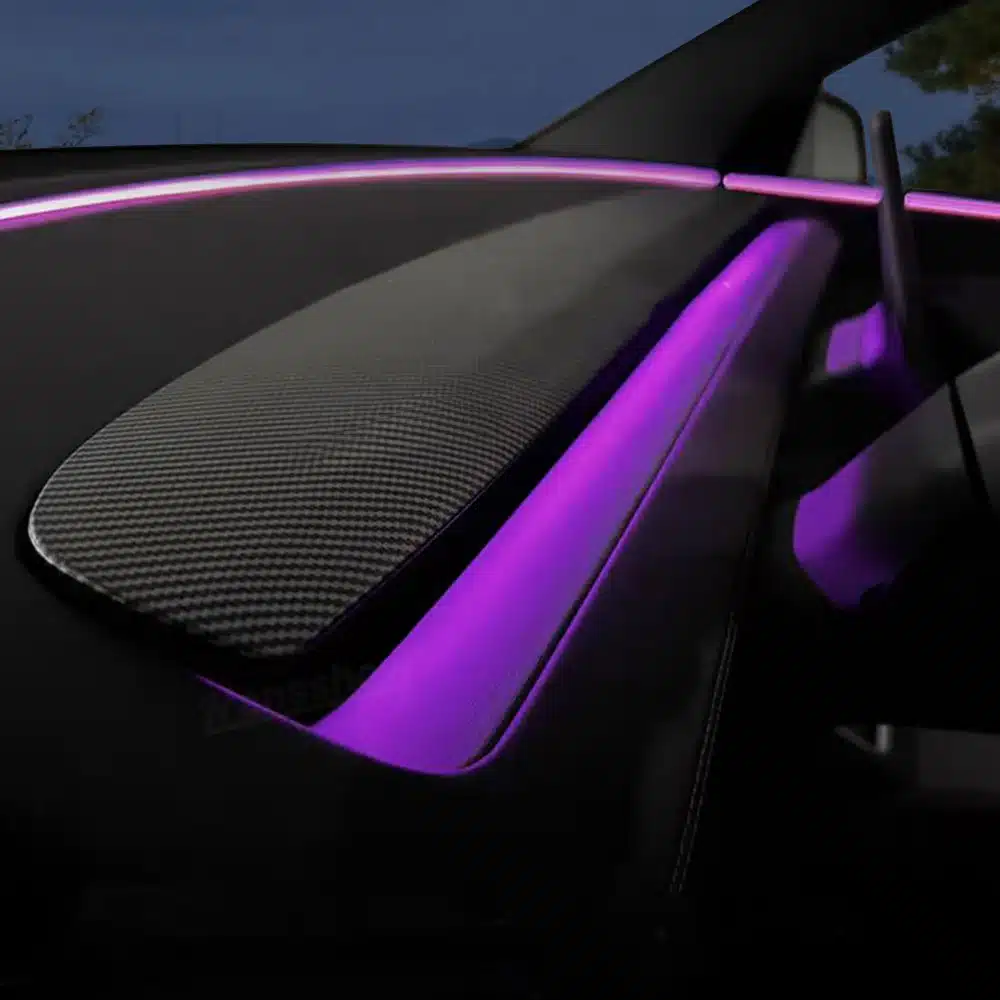 Upgrade het interieur van je Tesla Model Y Juniper of Model 3 Highland met deze hoogwaardige dashboardbekleding met dynamische LED-sfeerverlichting 3.0. Deze vervangende bekleding sluit naadloos aan op het originele ontwerp en is voorzien van meeslepende verlichting in maar liefst 128 kleuren. Bedien de lichtinstellingen eenvoudig via het Tesla-scherm of een handige app – volledig geïntegreerd met je voertuig.