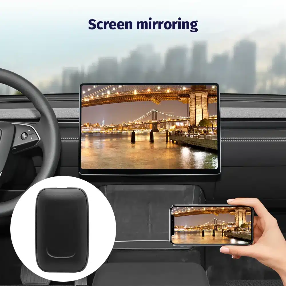 De draadloze CarPlay adapter is ontworpen voor een stabiele draadloze ervaring. Dankzij de quad-core Cortex A35, dual-band 2.4G/5G WiFi en Bluetooth 5.2 blijft de verbinding snel, soepel en betrouwbaar. Navigatie reageert vlot, audio blijft stabiel en bellen klinkt helder. De ondersteuning voor 1080P videodecoding zorgt bovendien voor scherpe weergave en vloeiende animaties op Teslaโ€™s grote touchscreen.