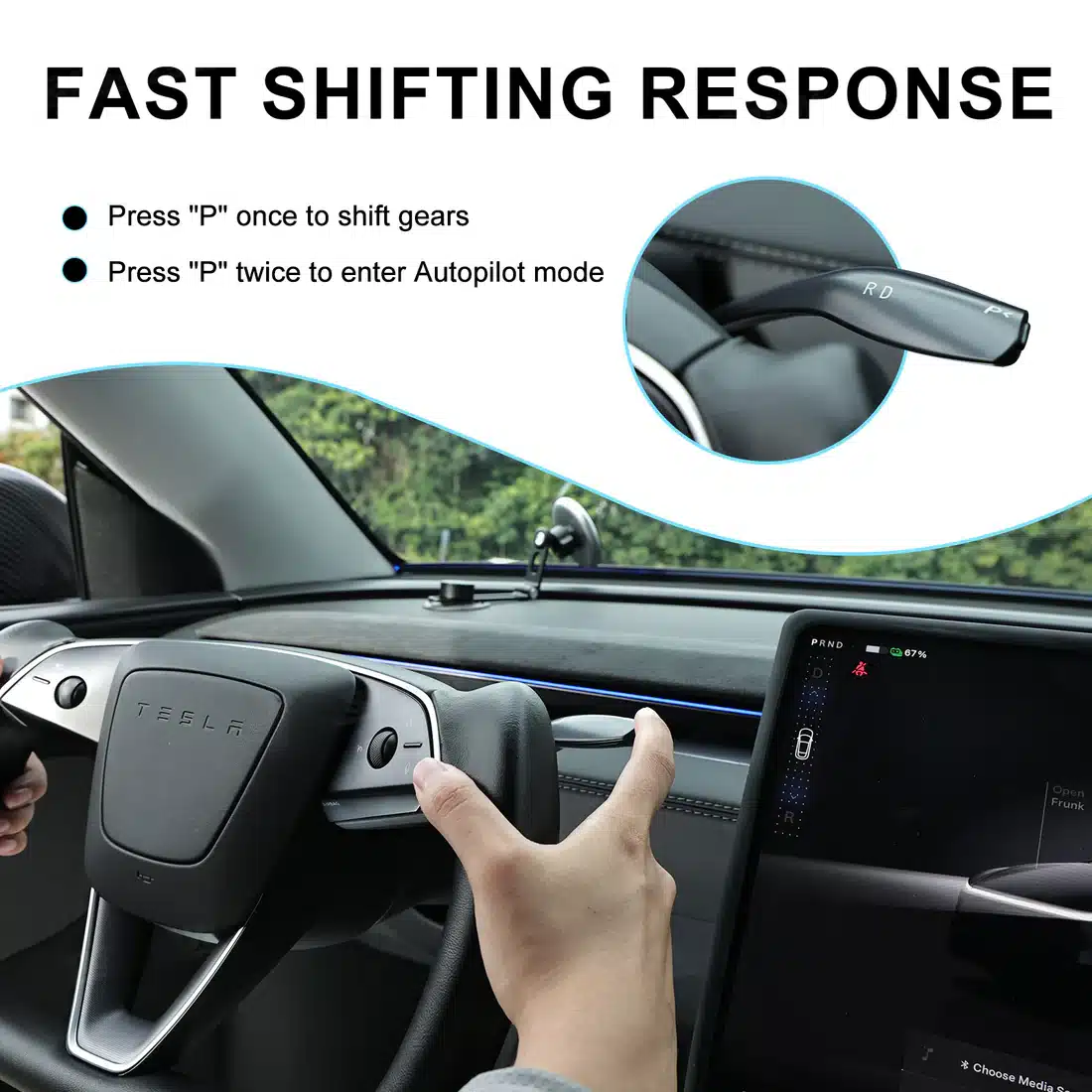 De bediening is intuรฏtief: tik omlaag voor Autopilot, schakel zonder vertraging en parkeer met รฉรฉn druk op de knop. Een krachtige automotive-grade chip garandeert een razendsnelle respons. De installatie is eenvoudig en niet-destructief โ€“ binnen 20 minuten klaar, zonder boren of kabels trekken.