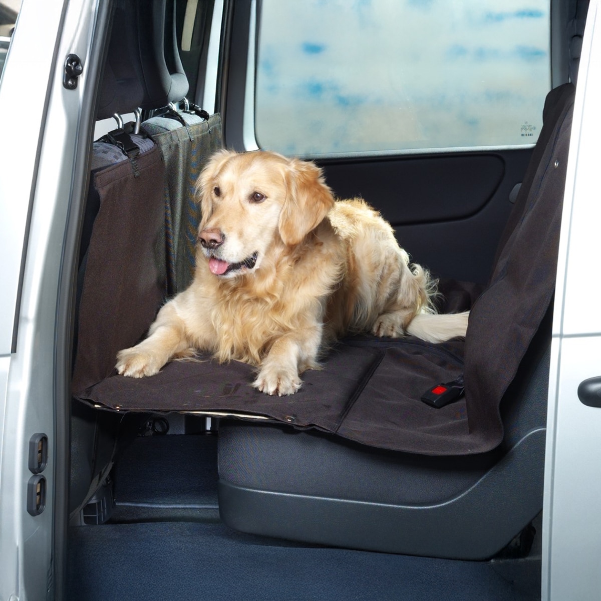 Dankzij een centrale ritssluiting is de deken deels op te vouwen, ideaal als je ook een medepassagier meeneemt of een deel van de achterbank wilt neerklappen om lange spullen te vervoeren. Bovendien maken de afsluitbare openingen het mogelijk om een hondengordel veilig door te voeren.