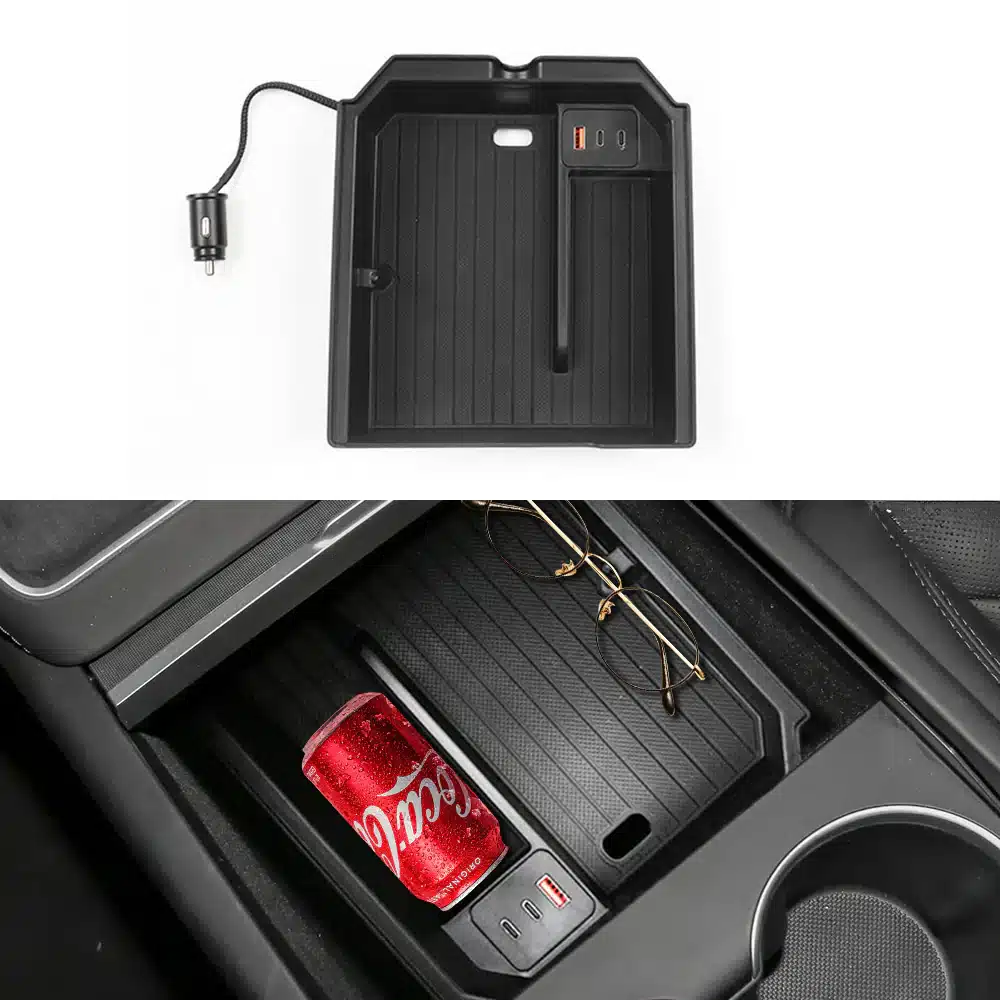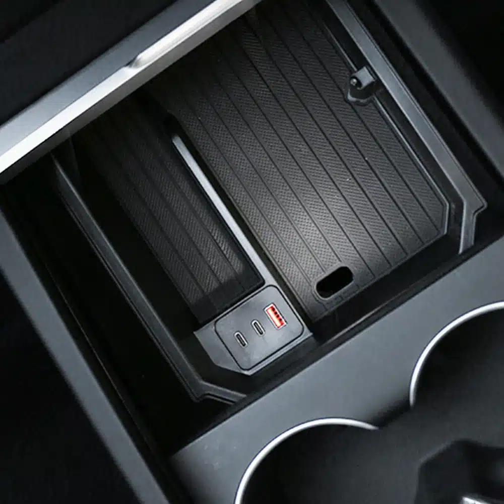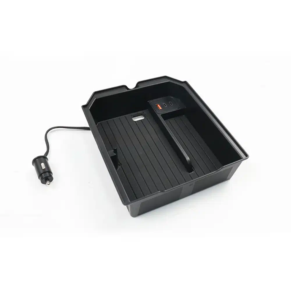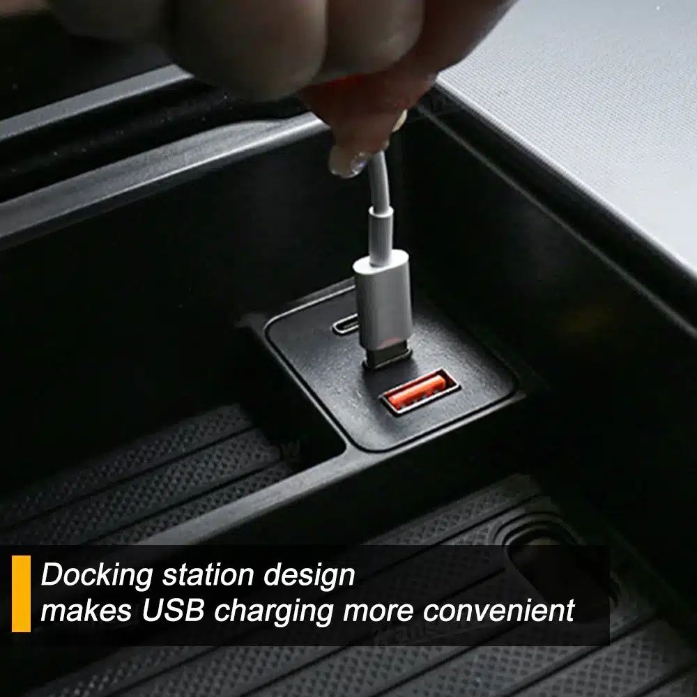 Breng orde, stijl en functionaliteit in je Tesla met de middenconsole organizer met dockingstation, speciaal ontworpen voor de Model Y Juniper en Model 3 Highland. Deze op maat gemaakte organizer sluit naadloos aan op het originele interieur en biedt een elegante, opgeruimde oplossing voor je dagelijkse ritten.