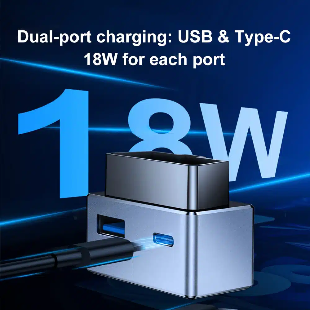 De twee USB-poorten zijn beide goed voor 18W snelladen – ideaal voor het gelijktijdig opladen van je smartphone, tablet of accessoires. Dankzij de duurzame aluminiumlegering is de behuizing niet alleen sterk en krasbestendig, maar zorgt hij ook voor uitstekende warmteafvoer en een premium uitstraling.