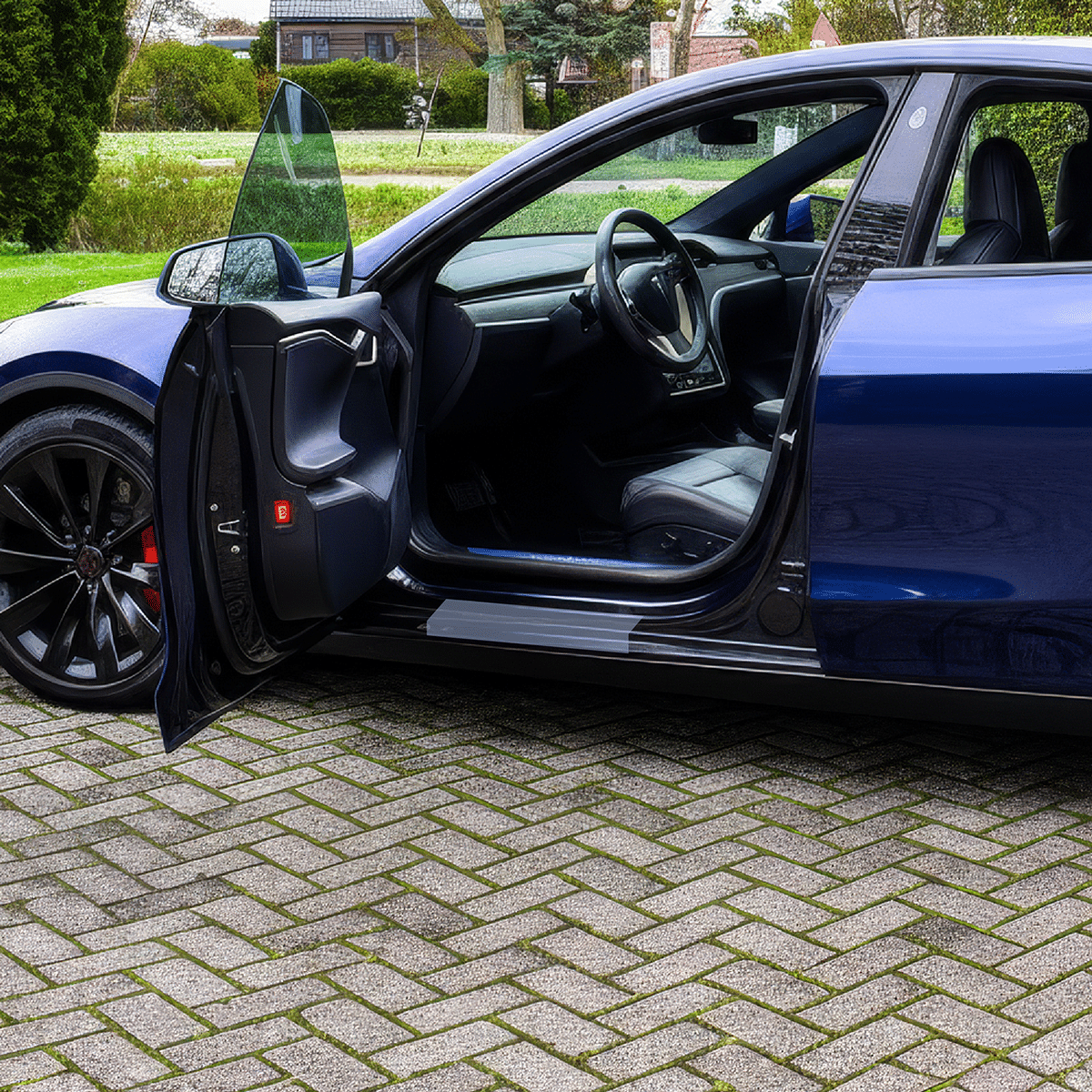 Met transparante PPF beschermingsfolie bescherm je de instapdorpels van je Model Y op een eenvoudige en effectieve manier tegen lakschade. De dorpels behoren tot de meest kwetsbare delen van de auto, omdat ze dagelijks in contact komen met schoenen, hakken, kinderlaarzen, tassen of boodschappen die langs de rand schuren. Daardoor ontstaan al snel kleine krasjes, doffe plekken en zichtbare slijtage, zeker bij intensief gebruik of wanneer je vaak passagiers vervoert.