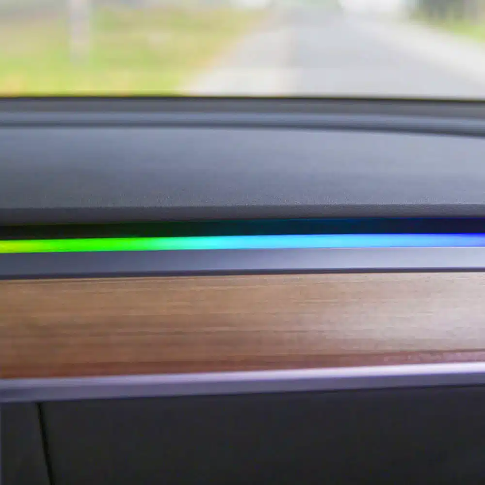 De dubbele RGB-LEDstrips zijn subtiel verwerkt in de ventilatieroosters, waardoor ze naadloos opgaan in het originele dashboarddesign.